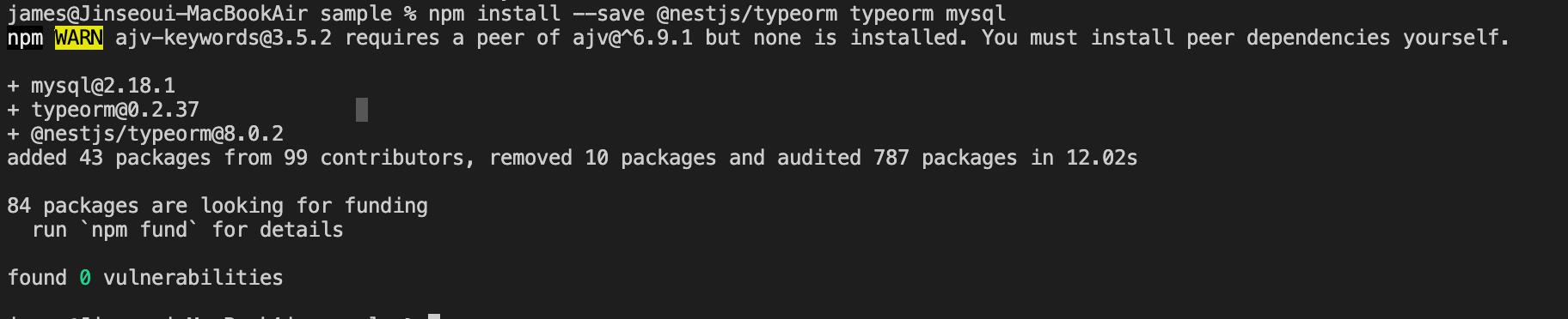 $ npm install --save @nestjs/typeorm typeorm mysql