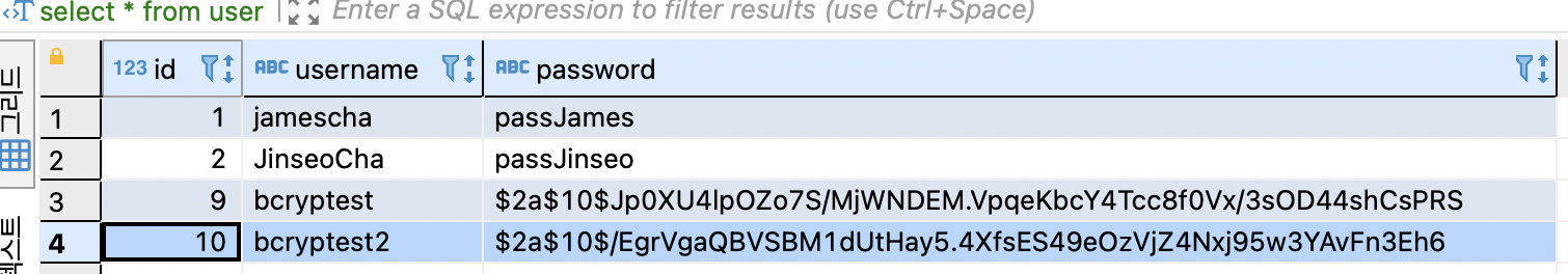 - Bcrypt : plain password -> salt + plain password -> Hashed password