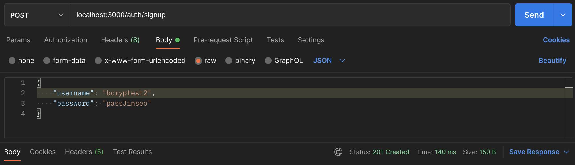 ... import * as bcrypt from 'bcryptjs'; // 1 @EntityRepository(User) export class UserRepository extends Repository<User> { async createUser(AuthCredentialsDto: AuthCredentialsDto): Promise<void> { const { username, password } = AuthCredentialsDto; // bcrypt password const salt = await bcrypt.genSalt(); // 2 const hashedPassword = await bcrypt.hash(password, salt); // 3 const user = this.create({ username, password: hashedPassword }); try { await this.save(user); } catch (error) { console.log(error); if (error.code === 'ER_DUP_ENTRY') { throw new ConflictException('Existing username'); } else { throw new InternalServerErrorException(); } } } }// 1. import bcryptjs module into the repository