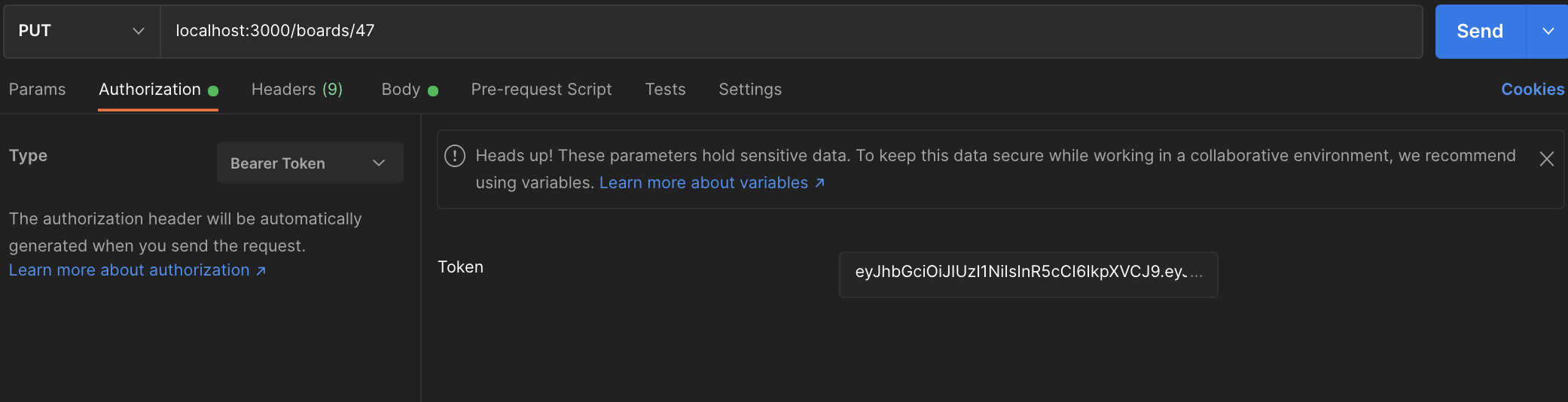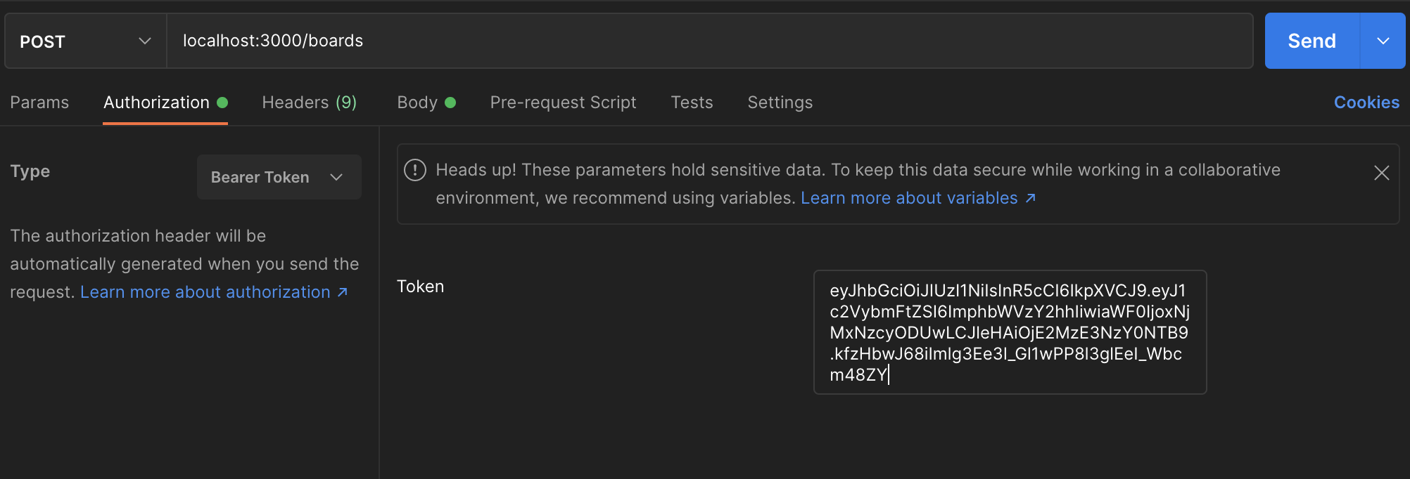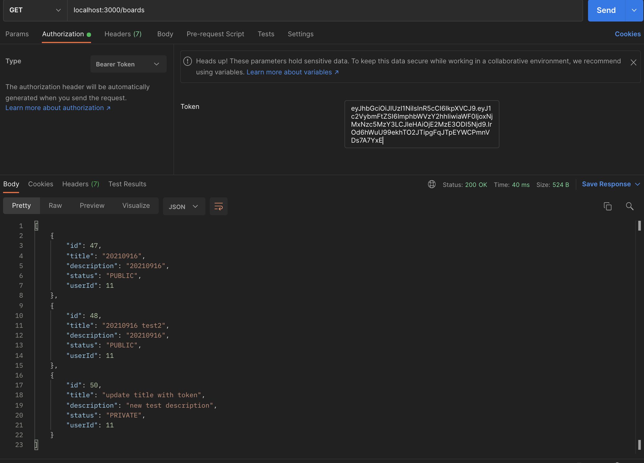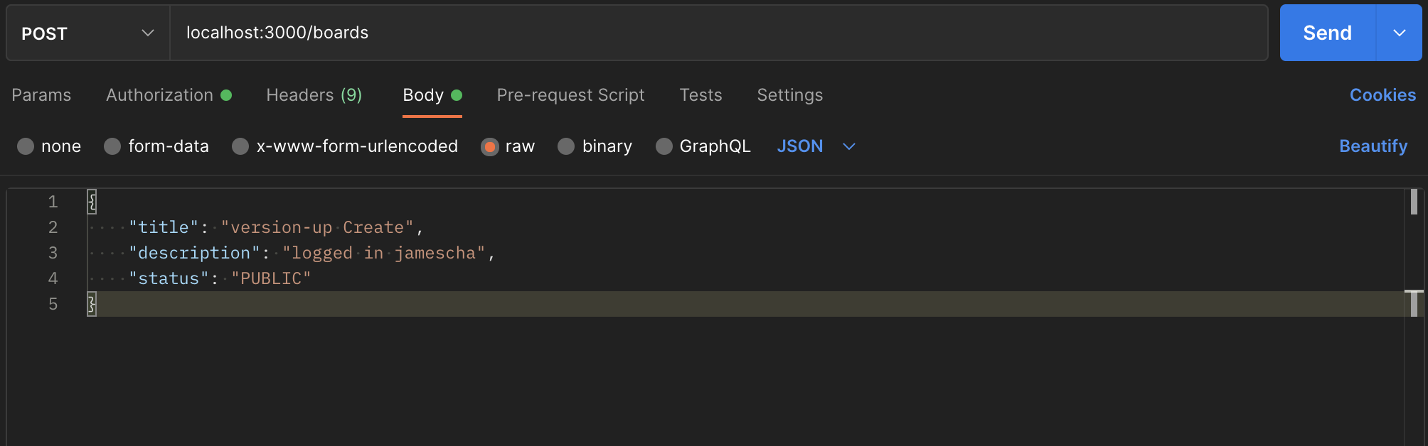 - At this time, we use an AccessToken and Custom decorator(@GetUser()) to insert a board.