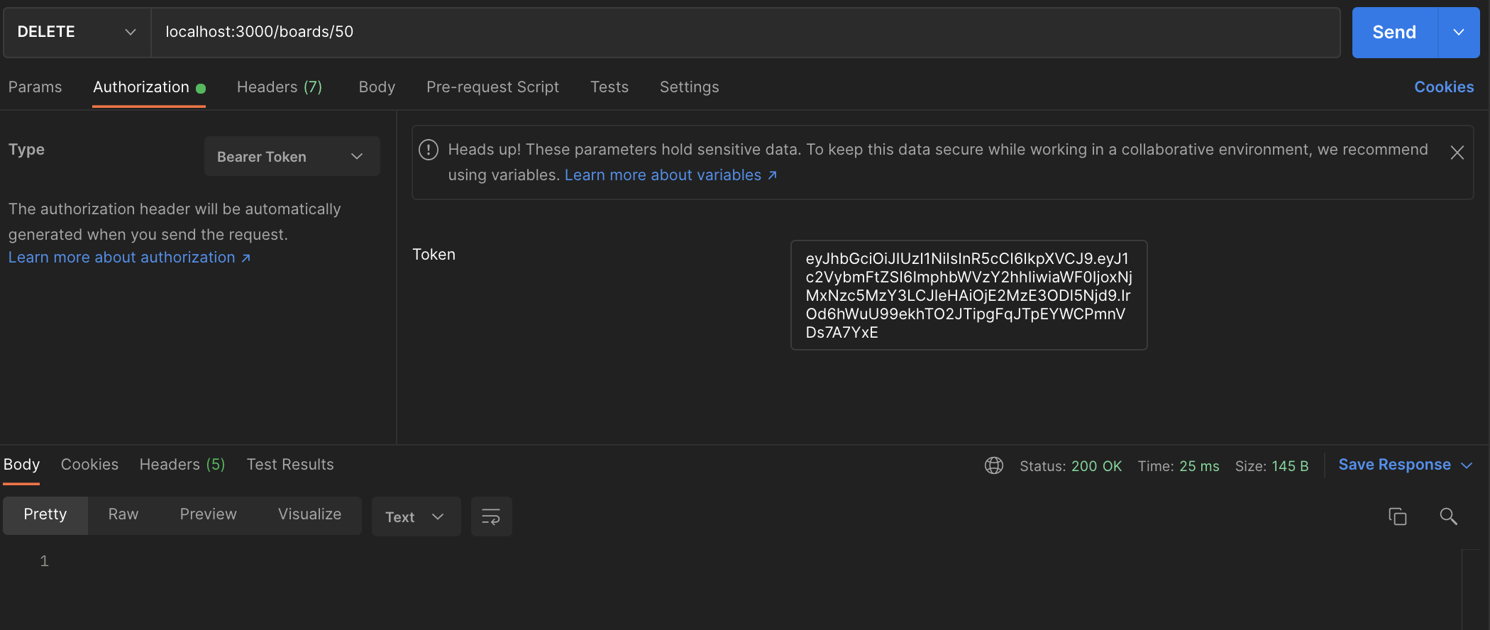- if the id in user Entity and found row's userId are different, it not affected- Send a request to delete a board and check a response